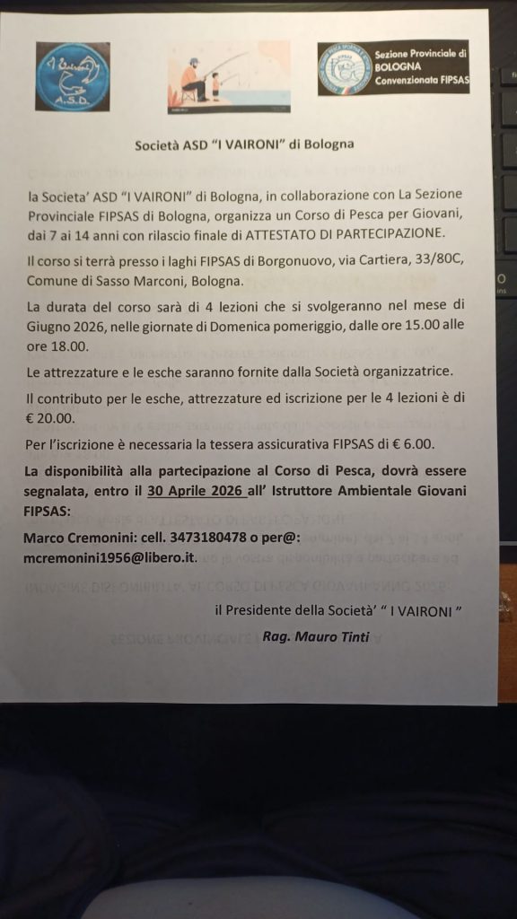 Nelle domeniche di giugno la ASD “I VAIRONI”, in collaborazione con la Sezione convenzionata FIPSAS di Bologna, organizza un corso di pesca per giovani dai 7 ai 14 anni presso l’impianto federale “SAPABA” di Sasso Marconi.